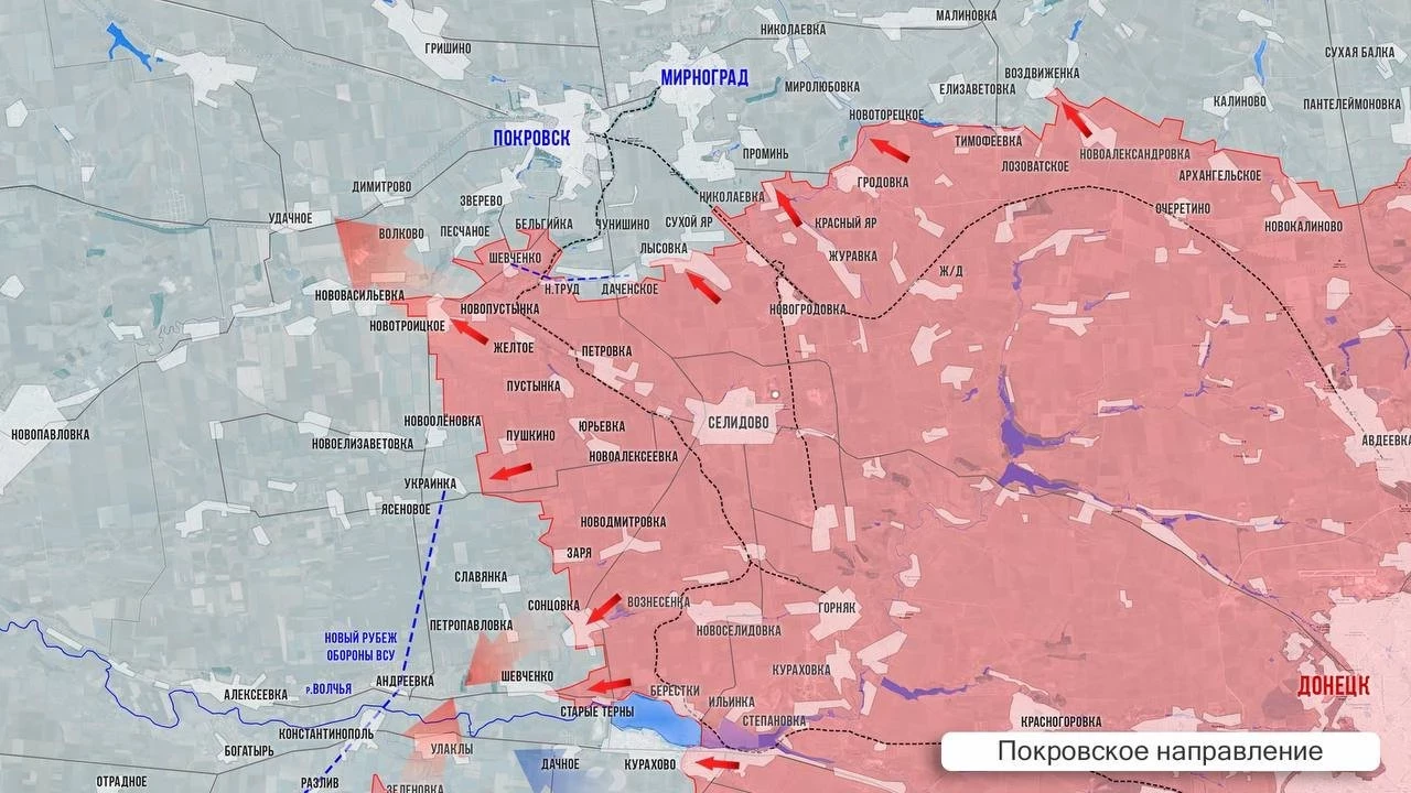 На Покровском фронте МО заявило об освобождении села Новый Труд. Ресурсы противника сообщают, что армия России практически освободила соседнее Даченское. ВСУ сохраняют присутствие на восточных окраинах, ближних к Лысовке, где наши усилили натиск. Западнее наши бойцы штурмуют Песчаное от которого вышли к северным окраинам Волково. Упорные бои идут по линии Волково-Соленое-Нововасилевка. Между Нововасилевкой и Новоелизаветовкой штурмовики продвинулись широким фронтом на глубину от 1 до 3 км. Со стороны Новоленовки - ВС РФ мощно продвинулись в направлении Украинки. Значительную территорию взяли под контроль северо-западнее Зари - это позволит выйти в тыл гарнизонам в Славянке и Украинке. Упорнейшие столкновения в районе Сонцовки и Петропавловки за выход к трассе на Андреевку.