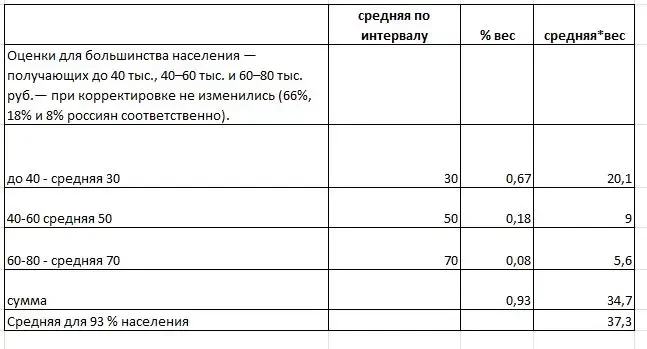 Согласно интересной публикации «Коммерсанта» «Богатых пересчитали по налогам» (окт. 2024), эксперты Высшей школы экономики оценили, что доходы «…большинства населения — получающих до 40 тыс., 40–60 тыс. и 60–80 тыс. руб… [составляют] 66%, 18% и 8%... соответственно). Из этих данных среднюю зарплату для 93% населения можно грубо оценить примерно в 37,3 тыс. в месяц. Расчет приведен ниже. В первом интервале мы берем среднюю зарплату в 30, во втором — 50, в третьем — 70 тыс. руб.