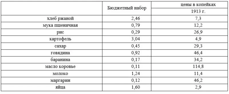 Потребительная корзина в ЦР была несколько иной и более скудной, но нужно найти хоть какой-то эталон. По данным (Народное хозяйство СССР. Том II. Глава VIII. Заработная плата рабочих), для бюджетного набора того времени можно использовать набор продовольственных продуктов в Москве на одну неделю, опубликованный в журнале Международного Бюро Труда в 1928 г. (все в килограммах, кроме молока в литрах и яиц в штуках; цены за килограмм, литр молока и яйцо в копейках):