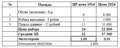 Стоимость современного МПНП в Царской России составила 9,98 рубля, а в 2025 г. по Москве — оказалась выше официальных данных 7 500 — 8 031 руб. Цены взяты на конец января 2025 по данным «Пятерочка» и «Перекресток». В качестве средней ЗП в 1914 берем среднюю ЗП рабочих — 22 рубля, в целом по стране данных нет. Переводной эквивалент для МПНП равен 816,6, что соответствует оценке, сделанной в первой статье по 32 продуктам (851 рублей за ц. рубль). Получим, что на среднюю ЗП в 1914 можно было купить 2,24 МПНП, а сегодня 37,3 тыс. руб. — 4,65 МПНП.