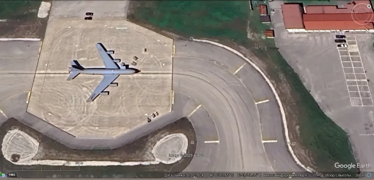 Спутниковый снимок Google Earth: самолёт заправщик КС-135 на авиабазе Авиано