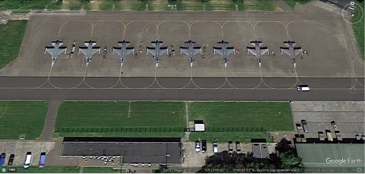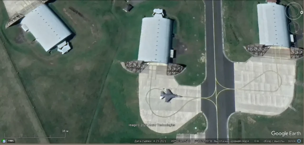 Спутниковый снимок Google Earth: истребитель F-16C на авиабазе Шпангдалем