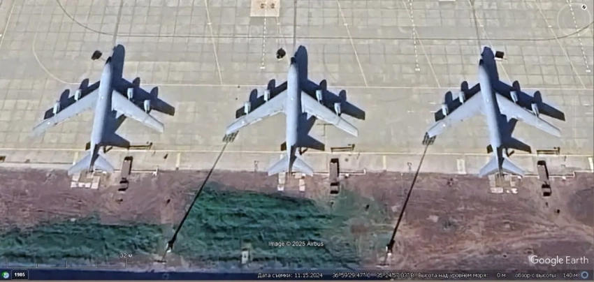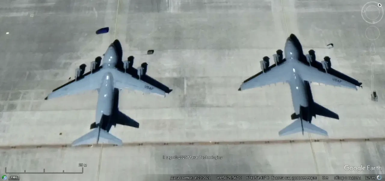 Спутниковый снимок Google Earth: военно-транспортные самолёты С-17А на авиабазе Шпангдалем