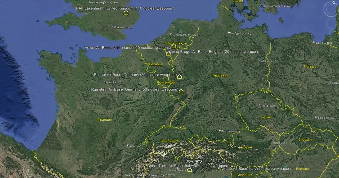 Примерно 20 лет назад США вывезли ядерные бомбы с базы Рамштайн в Германии. Однако, по имеющейся информации, хранилища ядерных боеприпасов на этом объекте в состоянии принять 220 авиабомб В61.