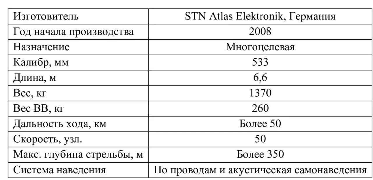 Основные ТТХ торпеды Atlas Elektronik DM2A4 Seehecht