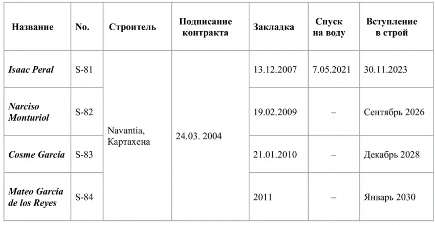 В 2004 году министерство обороны Испании заключило с государственной судостроительной компанией Izar Construcciones Navales S.A. (впоследствии Navantia) контракт на строительство четырех лодок типа S-80, а в следующем году приступили к постройке головной лодки. Вступление кораблей в строй намечалось с конца 2013 до начала 2016 гг.
