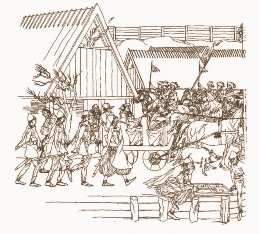 Пиво передавалось в рогах через огонь, который горел посредине палаты.