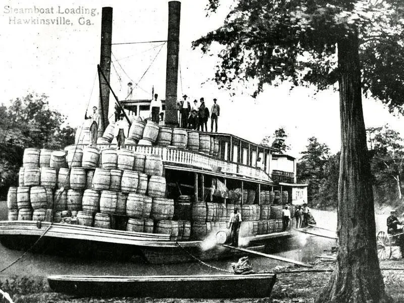 А это пароход с грузом бочек! Так и видится мне диорама: пароход с бочками и людьми. Узкая река. А вокруг пальмы, пальмы, пальмы...