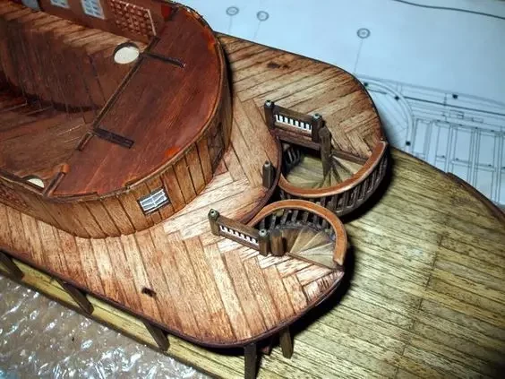 Поскольку пароходов было очень много и самой различной архитектуры, на свою модель вы можете поставить и вот такие винтовые трапы
