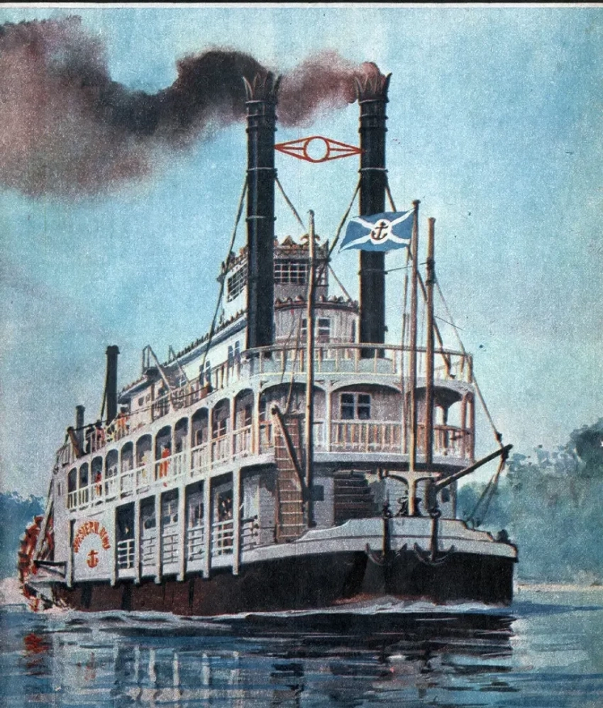Пароход «Ривер Белле» украшали даже оленьи рога! А еще у него очень красиво были оформлены кожухи гребных колес… Иллюстрация Дина Корнвелла