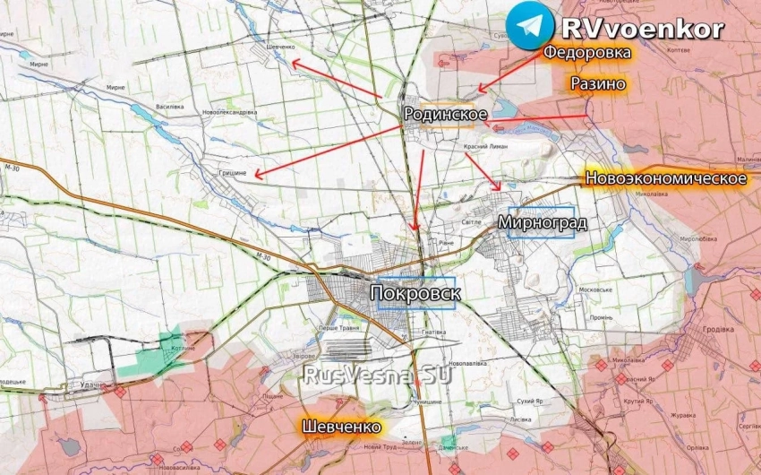 С востока наши войска штурмуют позиции у Мирнограда и Чунишино. Под Родинским идут активные уличные сражения. Обход Белицкого с юга позволяет ВС РФ выйти к Новому Донбассу и Кутузовке. До трассы Краматорск–Доброполье остаётся менее 3 км.