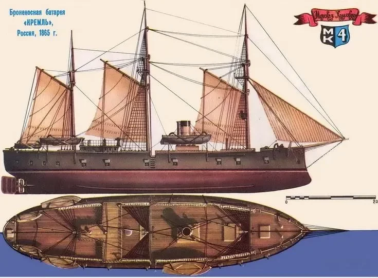 На «Кремле» отечественные кораблестроители отказались-таки от кормового тарана, что сразу дало прибавку к скорости в 1 узел. Корабль был заложен на верфи Семянникова и Полетики в Санкт-Петербурге 1 декабря 1864 года, строительством руководил Н. Е. Потапов. Паровую машину установили со списанного фрегата «Илья Муромец» — двухцилиндровая, запитывающаяся от 4 котлов, мощностью 913 лошадиных сил. В строй «Кремль» вступил в 1867 году. Корабль впервые получил полые железные мачты, которые, к тому же, использовались для вентиляции нижних палуб. Все три первых русских броненосца несли парусное вооружение трёхмачтовой марсельной шхуны (на «Кремле», по просьбе командира, добавили прямые паруса на грот-мачте — всё-таки у него корпус был сильно более мореходный), палубы поверх брони застилали досками: верхнюю и жилую — сосновыми, батарейную — дубовыми, в бортовых отсеках размещались цистерны, которые в бою предполагалось заполнять водой, погружая корабли дополнительно на 30,5 сантиметров в воду, что снижало поражаемую поверхность. Все корабли имели небольшую бронированную броневую рубку.