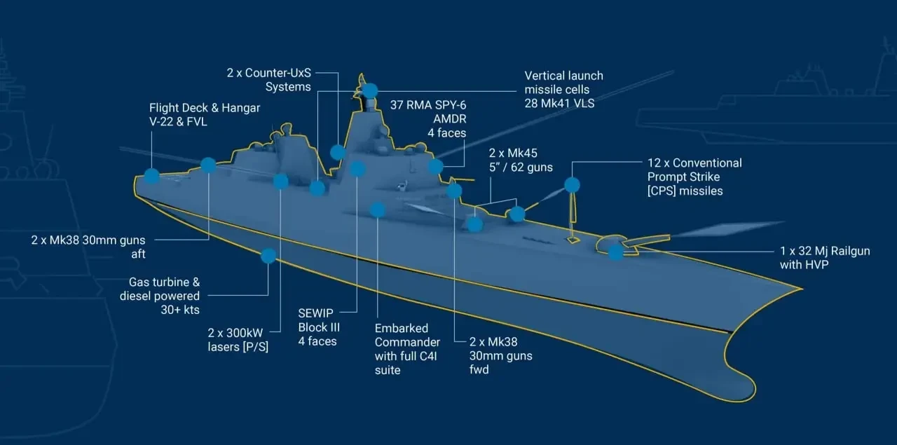 К настоящему времени были раскрыты только самые общие данные о будущем боевом корабле для ВМС США. На какой стадии в реальности находится этот проект, как скоро его удастся разработать и т.д., пока неизвестно. Также под вопросом точные характеристики, состав оборудования и вооружения.