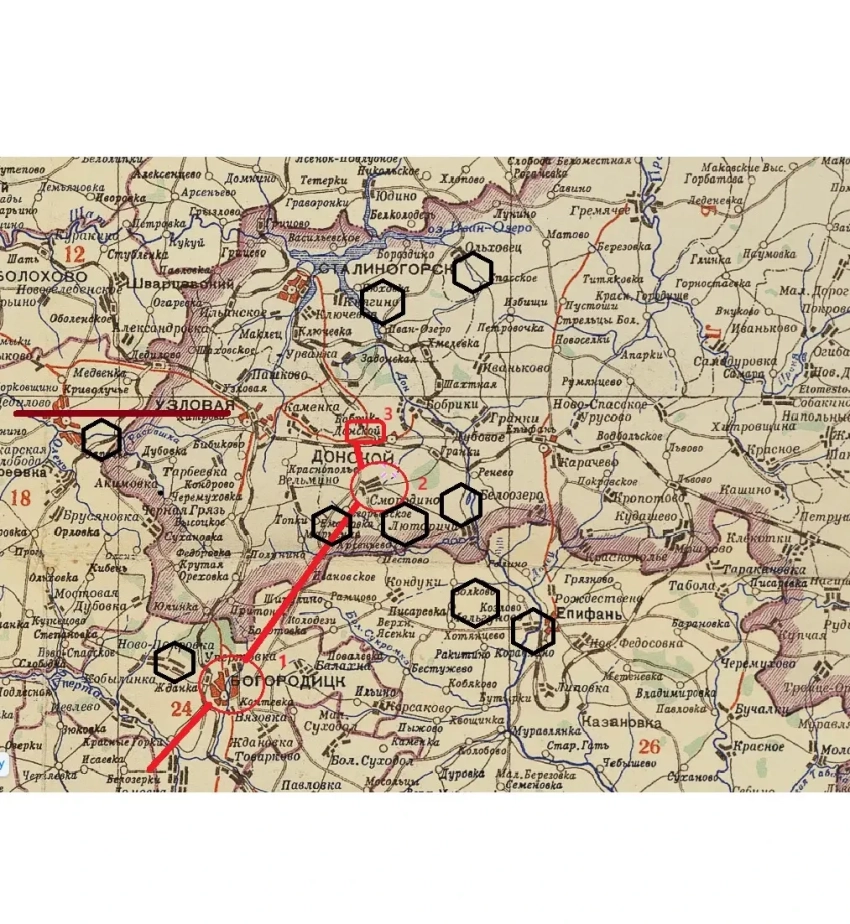 Примерное продвижение 110-го пехотного полка с 15 по 27 ноября 1941 года: 1 — взятие Богородицка 15 ноября, 2 — штурм позиций у Смородино 23 ноября, 3 — расположение полка в обороне с 25 ноября. Темно-красная линия — примерное направление наступления немецкой танковой группы. Черные шестиугольники — примерное расположение шахт