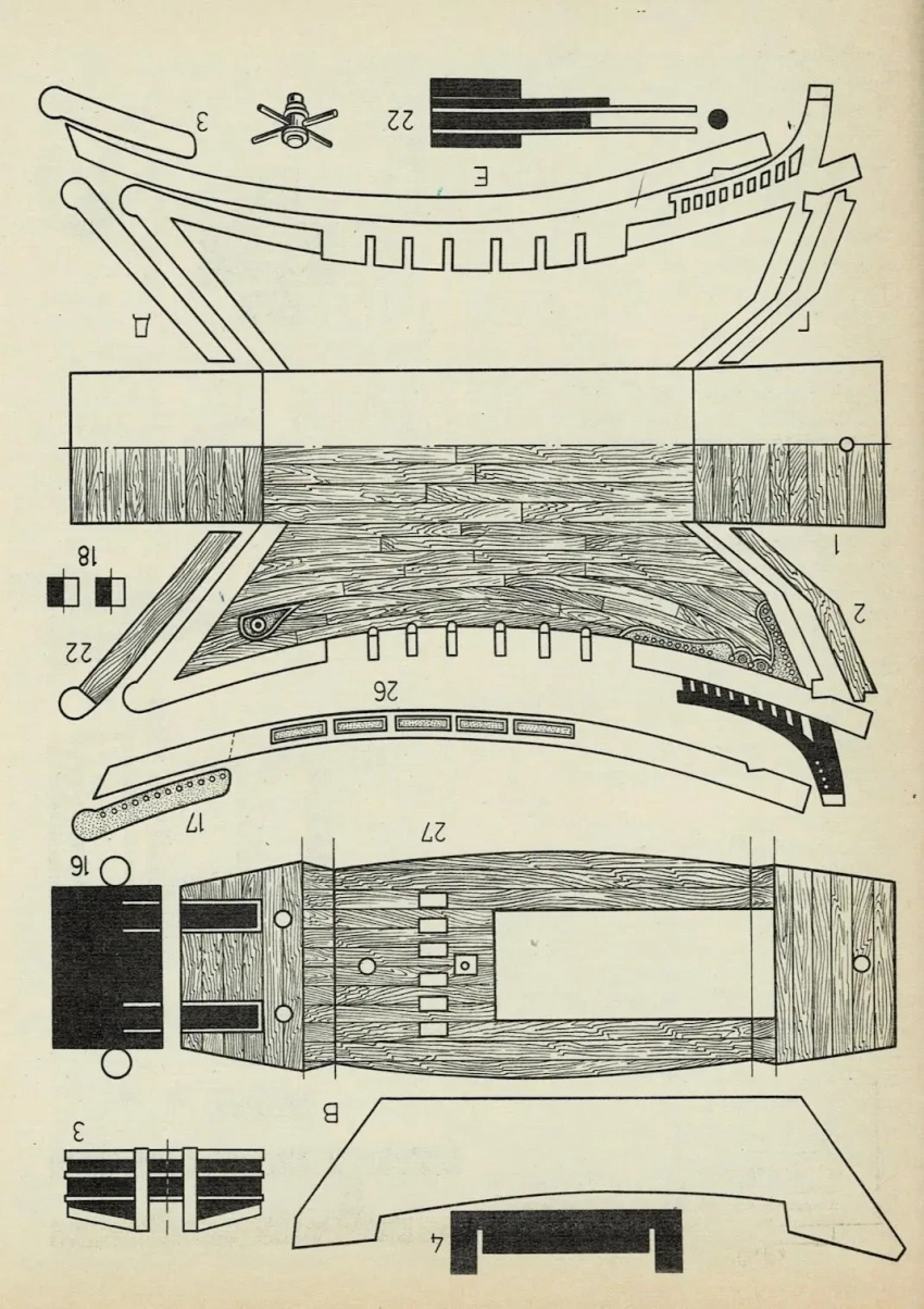 Проекции деталей модели джонки, которые можно заказать вырезать при помощи лазера. Рисунок из книги «Для тех, кто любит мастерить». М., «Просвещение», 1990