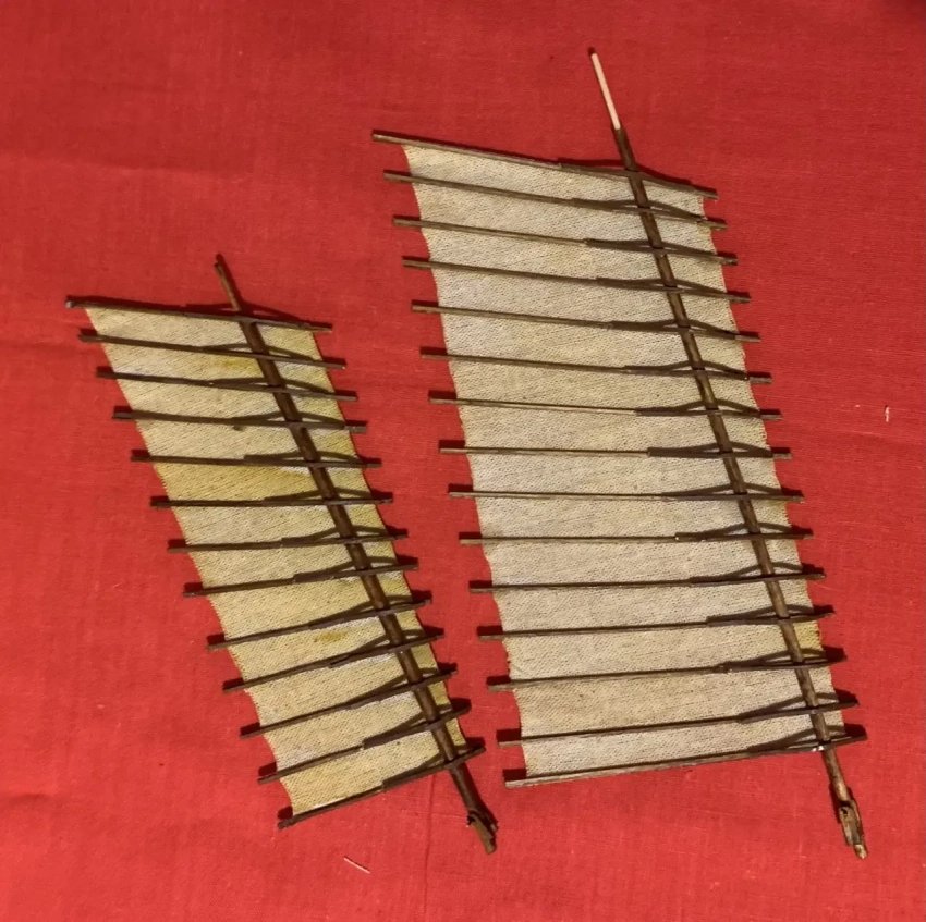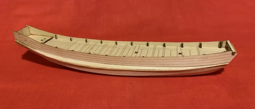 Детали корпуса стыковались между собой в целом неплохо. Не представляло особого труда и изготовление парусов с наклеенными на них рейками. Хотя, с другой стороны, изготовление полукруглых креплений самих этих реек к мачтам было делом… требующим аккуратности и терпения. Во-первых, на пять мачт их понадобилось очень много. Во-вторых, их все пришлось мочить в воде и выгибать при помощи электрического паяльника! Готовые паруса были окрашены водной морилкой, надеты на мачты и в таком вот уже собранном виде вклеены в отверстия на палубе, где предварительно была установлена вся необходимая «мелочевка».