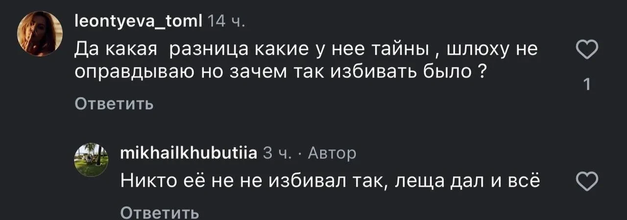 Скриншот из инстаграма* Михаила ХубутииВ телеграм-каналах после этого Малахова обвинили в виктимблейминге (обвинение жертвы в произошедшем с ней насилии или преступлении), а самого Хубутию — в заказной кампании по очернению Ван.