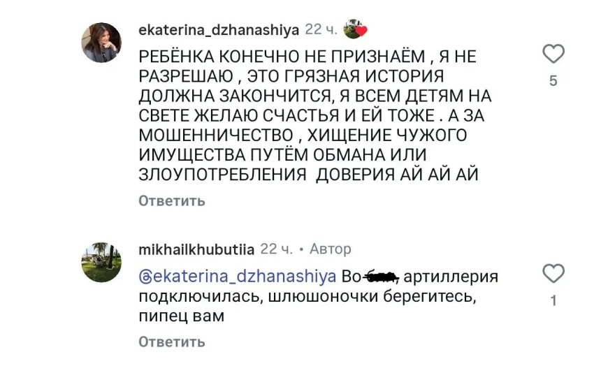 https://t.me/and_malakhov/1865В сети обратили внимание на комментарии под анонсом выпуска на странице Хубутии: в большинстве из них пользователи оправдывают экс-чиновника, тогда как в сторону Ван звучит критика. При этом сам Хубутия активно участвует в обсуждении, используя обсценную лексику. В комментариях также появилась законная жена экс-чиновника Екатерина Джанашия (пользователь ekaterina_dzhanashiya*), которая также высказалась о скандале.