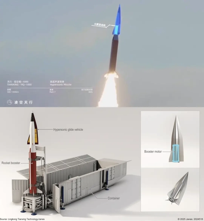 Китайской аэрокосмической компанией «Линкун Тяньсин» разрабатывается баллистическая ракета с планирующим гиперзвуковым боевым блоком YKJ-1000 с дальностью 1300 км, выполненная из недорогих коммерчески доступных материалов, например, в качестве теплостойкого покрытия используется пенобетон, что позволит производить эти ракеты крупной серией, недостижимой для существующих образцов гиперзвукового оружия.
