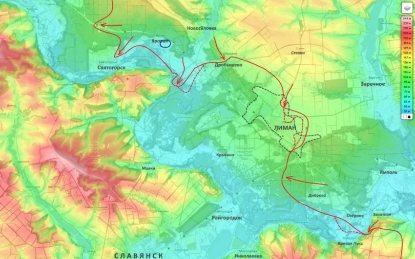 Особо тяжёлая обстановка сохраняется в Лимане. Город фактически разделён на зоны контроля, продолжаются встречные бои. Российские силы стремятся окончательно перерезать логистику противника и создать плацдарм для удара на Славянск с севера.