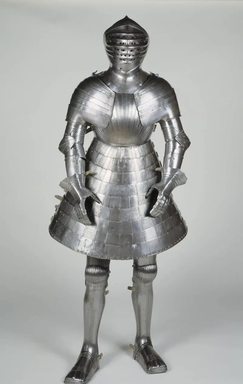 Так появился второй комплект доспехов, и тоже для пешего поединка. Собрали его как конструктор из уже готовых деталей, вероятно, выполненных разными мастерами в разное время. Но вот украсили его уже в едином стиле, чтобы никто ничего «такого» не подумал! В отличие от предыдущего доспеха, этот доспех имел «юбку» (тонлет) в форме колокола, из металлических полос, приклепанных к кожаной основе. Такая конструкция позволяла уменьшить вес доспеха и трудоемкость его изготовления за счет отказа от защитных деталей для ног выше коленей. Щитки на внешней стороне наколенников («раковины») в данном случае имели вид бантов на модных в то время подвязках.