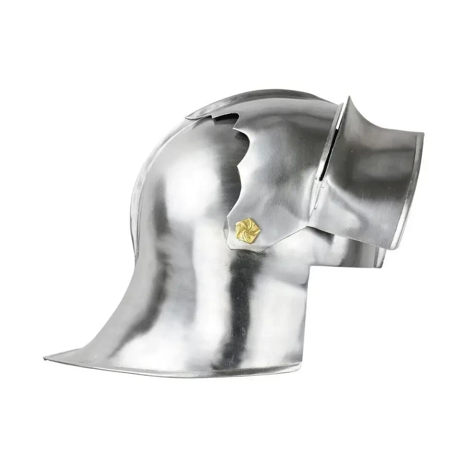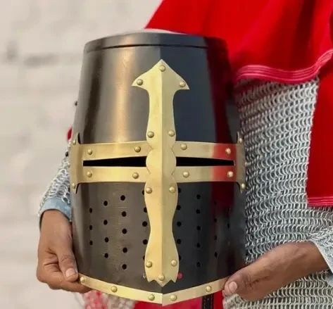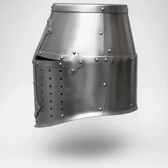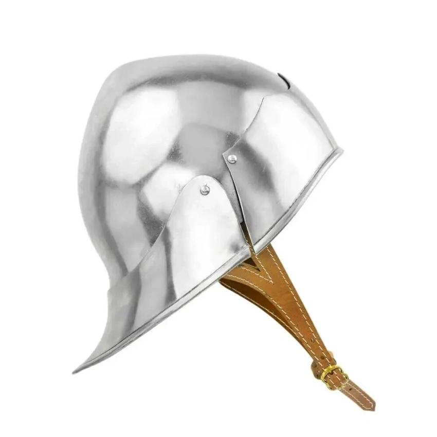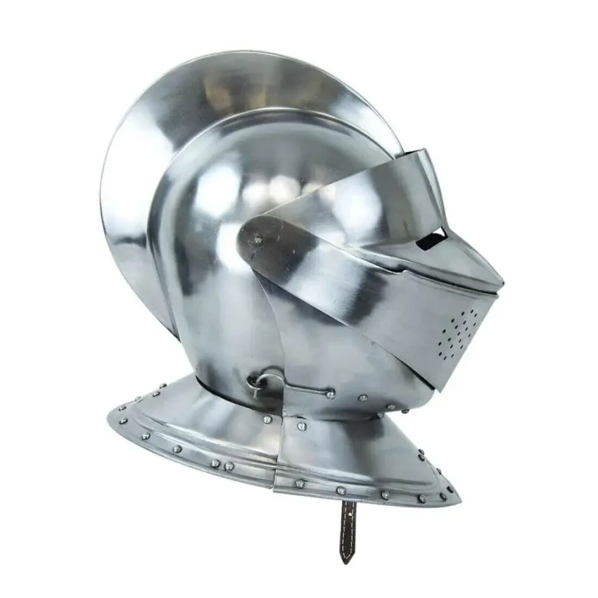 Ну, это что-то уж совсем примитивное. Зато недорого и потом на этот шлем можно прикрепить некие украшения, вырезанные из липовых ламелей и к тому же раскрасить в гербовые цвета. Потом надеваешь гербовое сюрко, под него стеганку и кольчужные совсем короткие нарукавники и… вот ты и рыцарь, ведь никто не не будет проверять – одета на тебе вся кольчуга, или же из под сюрко торчат лишь только рукава?!