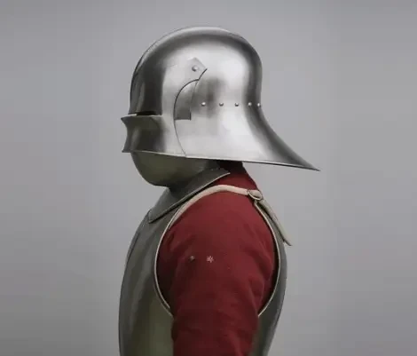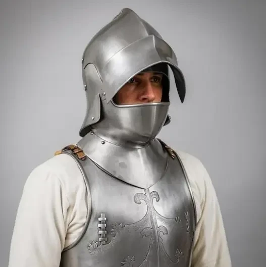 Салад, с понимающимся забралом, подбородник, горжет и кираса, с креплением для копейного крюка