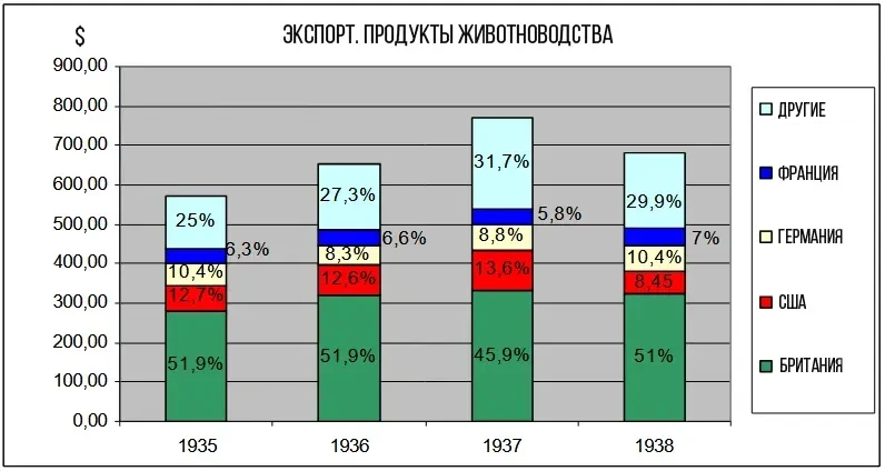 Довоенный экспорт аргентинской продукции животноводства. До Второй мировой войны Аргентина была крупным мировым экспортером продукции животноводства, особенно говядины. Это доминирование было обусловлено природными ресурсами Аргентины, включая обширные пастбища и развитием холодильных технологий, позволявших экспортировать свежую и охлажденную говядину, в отличие от более ранних периодов, когда рентабельной была только соленая говядина. Именно в этот период Аргентина пережила значительный экономический бум, обусловленный экспортом сельскохозяйственной продукции, включая продукцию животноводства, что еще больше укрепило ее позиции в качестве важного торгового партнера...