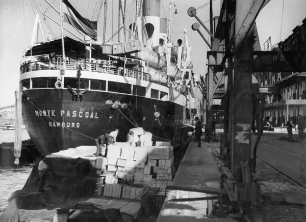 Немецкое судно Monte Pascoal класса «Монте» в порту Буэнос-Айреса. Будучи немецким грузовым лайнером, вмещавшим 2500 пассажиров третьего класса, Monte Pascoal курсировал между Гамбургом и Буэнос-Айресом. Это судно, как и другие подобные ему, способствовало прибытию многих еврейских беженцев из Германии в Аргентину после прихода к власти в Германии нацистов