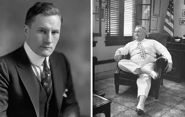Министр финансов США Генри Моргентау-младший (слева) и президент США Франклин Рузвельт. Генри Моргентау-младший сыграл важную роль в разработке и финансировании рузвельтовского Нового курса. В 1938 году, понимая, что система иммиграционных квот США недостаточна для размещения всего числа иммигрантов, желавших приехать в США, он предложил Рузвельту приобрести Британскую и Французскую Гвиану, чтобы использовать эти территории в качестве убежища для иммигрантов из нацистской Германии, но получил отказ...