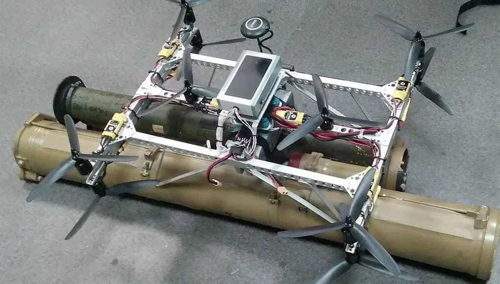 Хороший пример квадрокоптера рамной конструкции. Сразу хорошо цепляются два гранатомета. В этом же изделии видны робкие попытки использовать фермы, что будет обсуждаться ниже