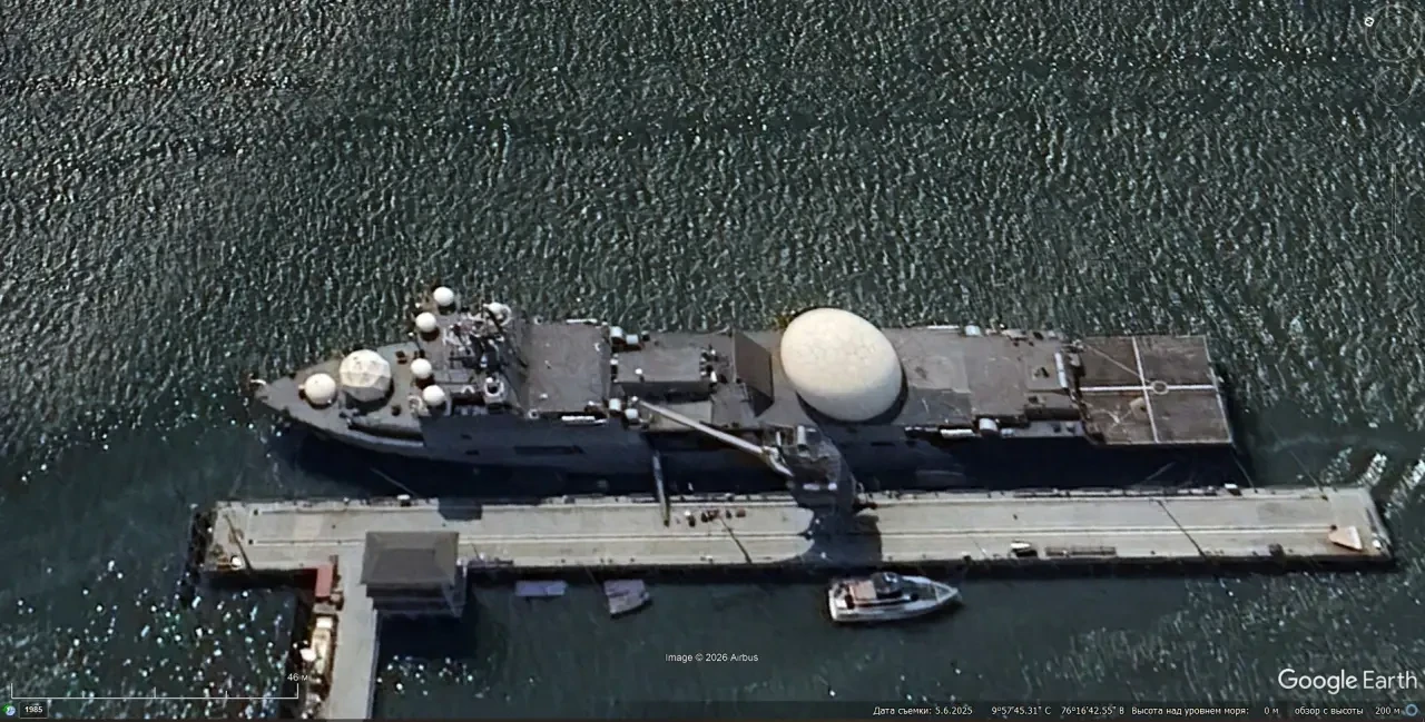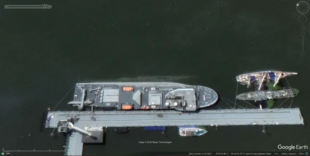 Cпутниковый cнимoк Googlе Еаrth: научно-исследовательское судно INS Dhruv у пирса в городе Кочин. Снимок сделан в мае 2025 года