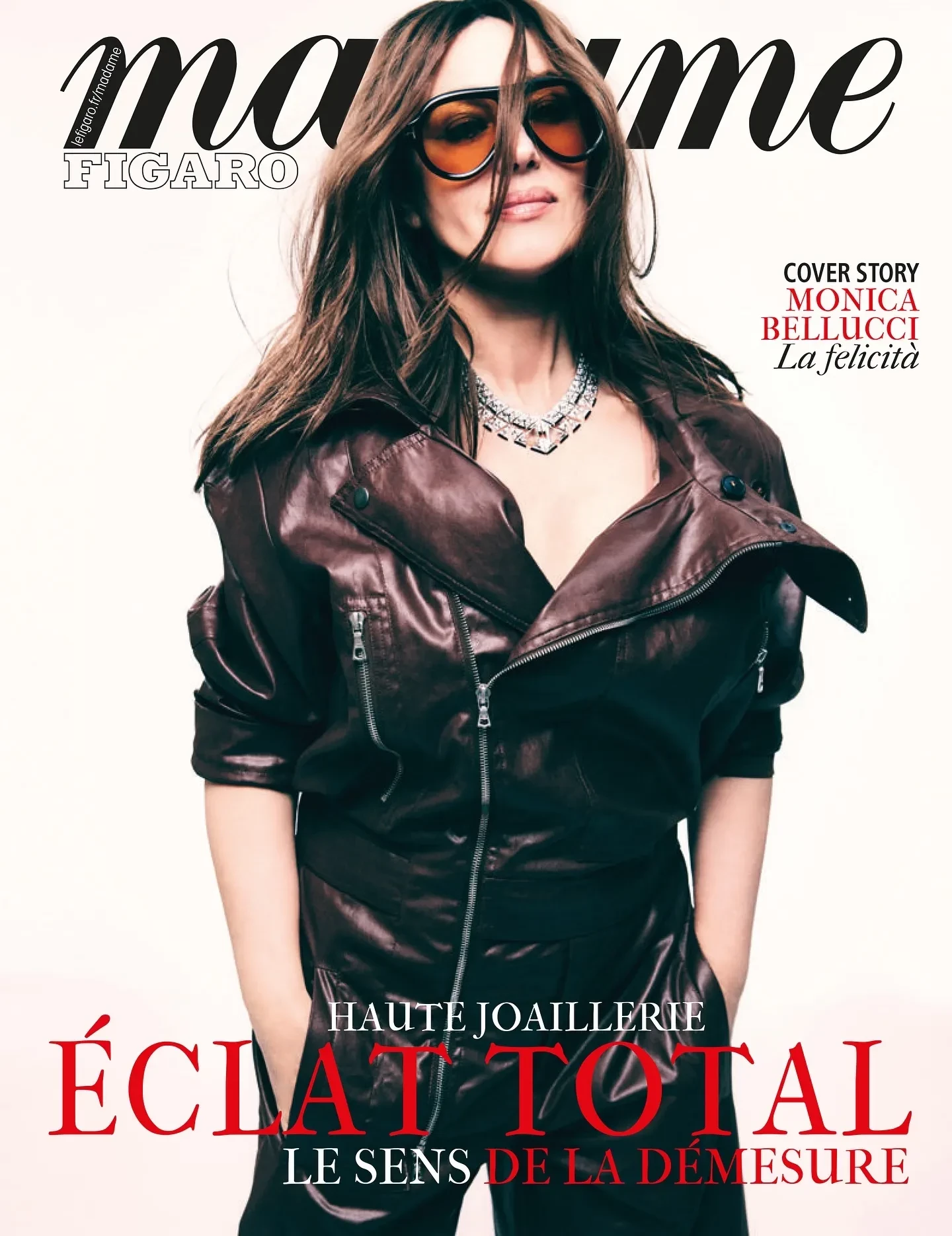 Моника Беллуччи снялась в фотосессии для французского журнала Madame Figaro. 60-летняя актриса появилась на обложке нового выпуска в чёрной кожаной куртке, надетой на голое тело, и брюках в тон. Из аксессуаров она выбрала массивное ожерелье Cartier.