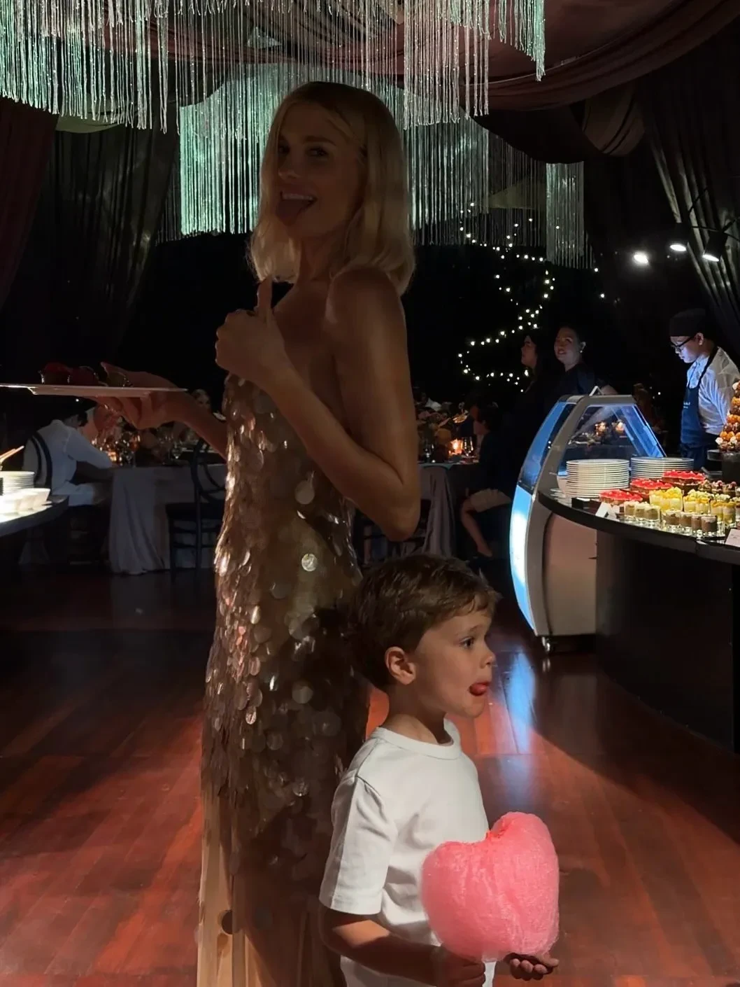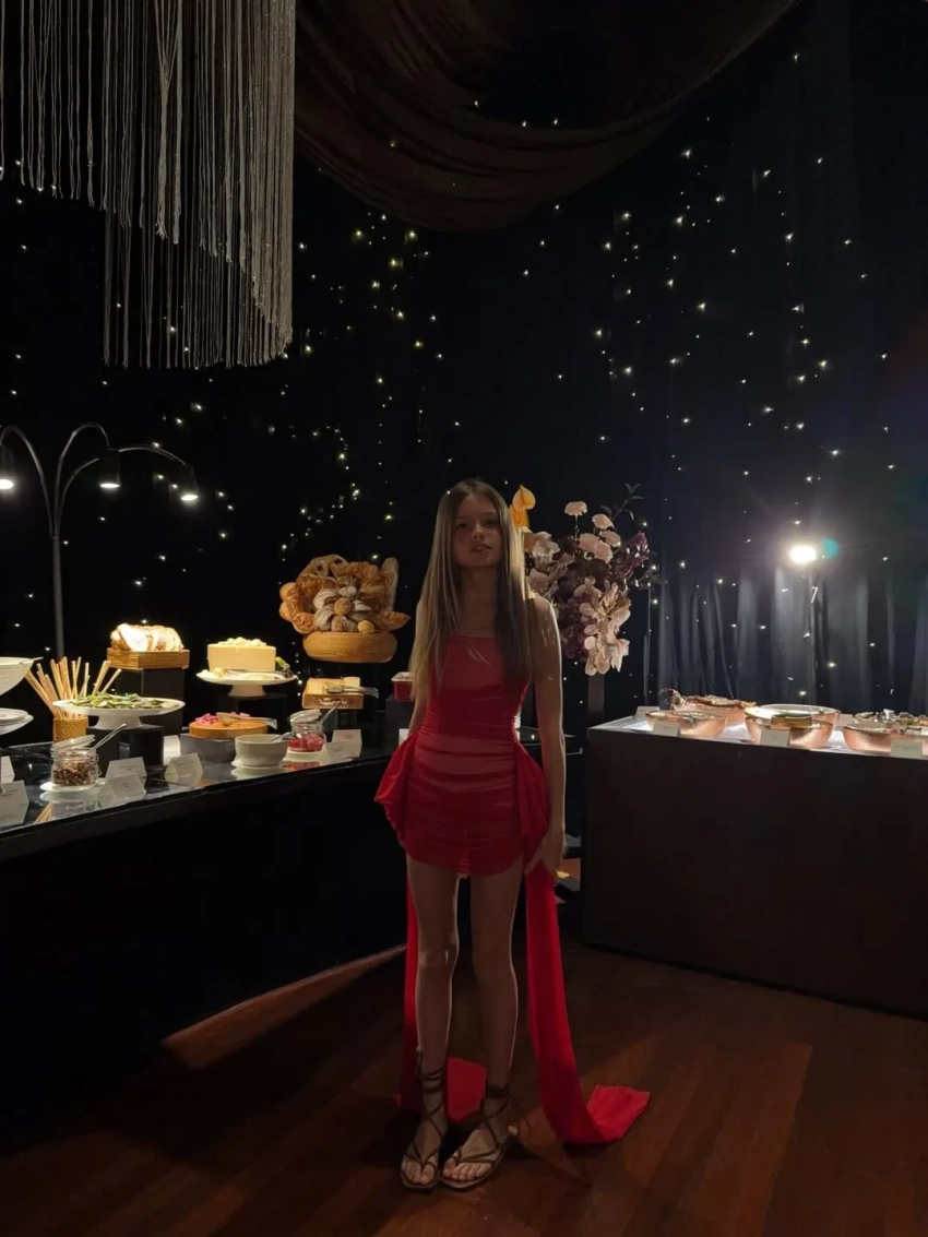 "Наш Новогодний вечер в самом волшебном месте", — написала Елена Перминова. В новогоднюю ночь она выгуляла два образа: платье с золотыми пайетками и прозрачной юбкой и голубое платье с вырезом на бедре. 11-летняя дочь Перминовой Арина уже примеряет наряды матери: она позировала на празднике в красном платье, в котором Елена отмечала свой день рождения в Венеции.