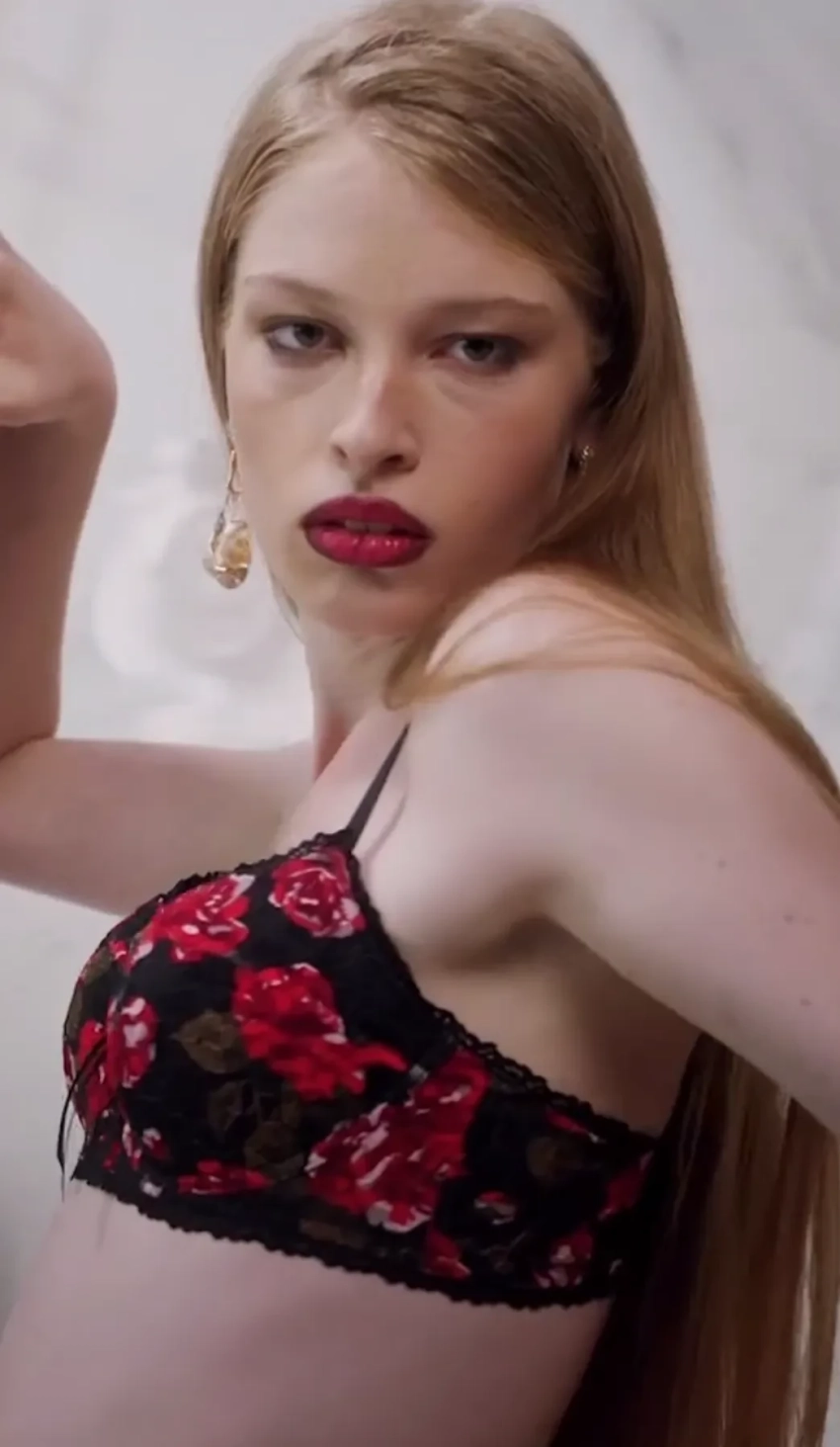 Для фотосессии 21-летняя модель примерила комплект белья с цветочным принтом и красные колготки, а также розовый пеньюар с туфлями в тон.