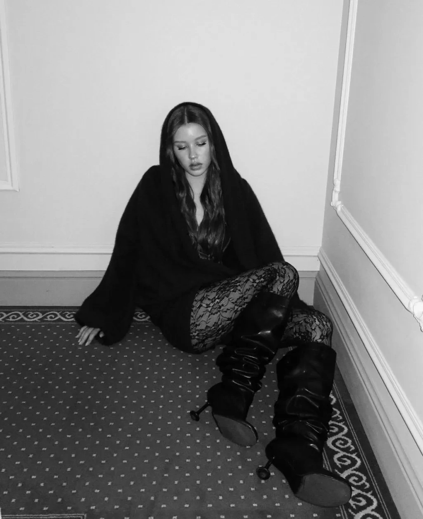 Пересильд снялась в закрытом сером платье с кожаными перчатками, а также в комплекте из вязаного лифа, джемпера и мини-шорт. Последний лук она дополнила кружевными колготками и ботфортами на каблуке.