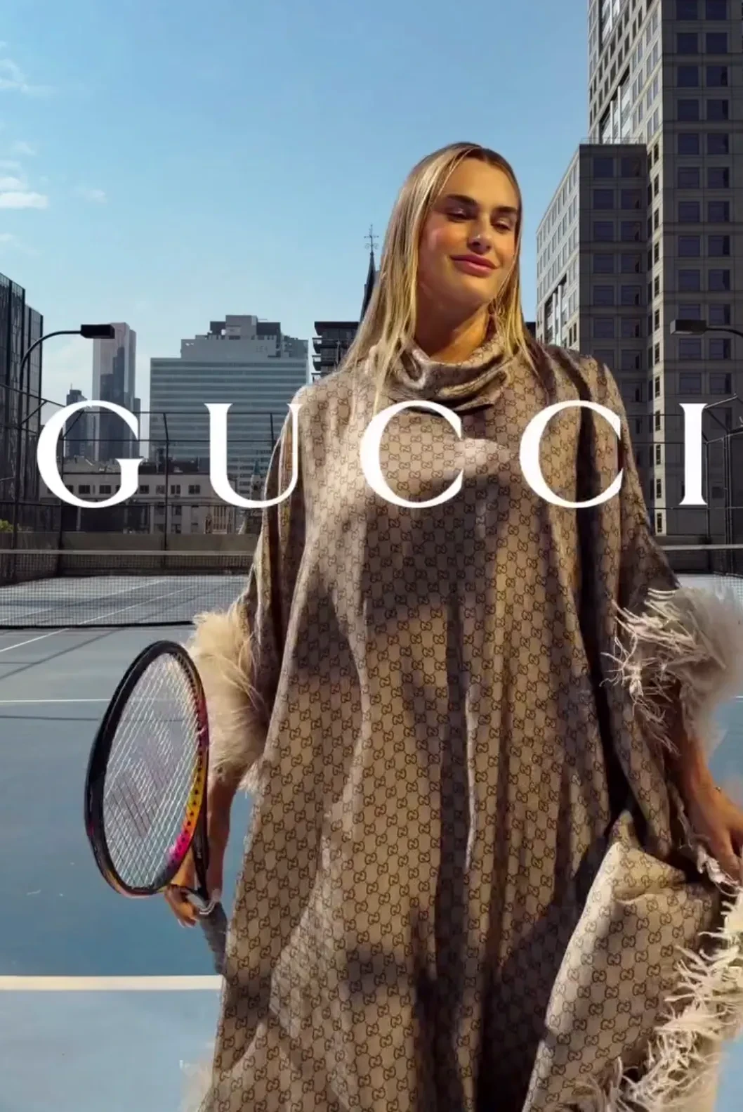 27-летняя теннисистка снялась в балахоне Primadonna из дебютной коллекции Демны Гвасалии для Gucci, который он посвятил Алле Пугачёвой. В видео Соболенко играет в теннис на корте в балахоне с перьями и в туфлях на каблуках. Также бренд опубликовал фото спортсменки в красном пальто и чёрных кожаных перчатках. "Добро пожаловать в семью Gucci, Арина", — написала команда модного дома.