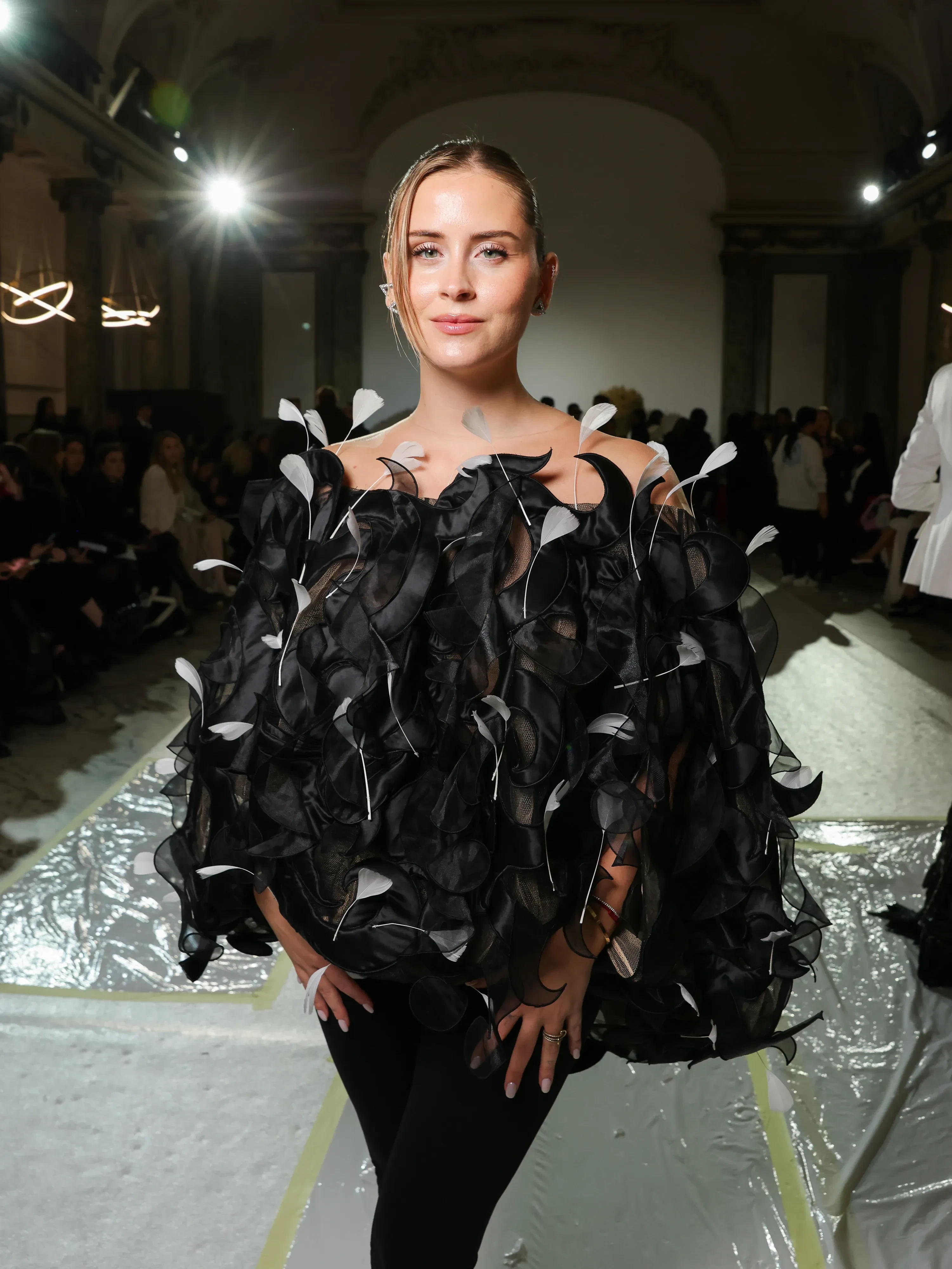 Гости показа YaninaСвою новую коллекцию основательница модного дома Yanina Couture Юлия Янина посвятила жизни и творчеству Коко Шанель — "от тишины монастырского приюта до сияния королевы, сумевшей создать собственное представление о роскоши, не имея её в наследство". Особое внимание дизайнер уделила любви Шанель к России, русскому искусству и людям.