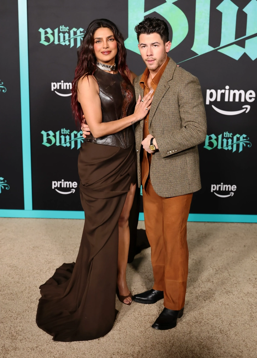 67-летняя Шэрон Стоун вышла в свет в брючном костюме и с декольте, а 43-летняя Приянка Чопра позировала в коричневом платье с кожаным корсетом и разрезом.