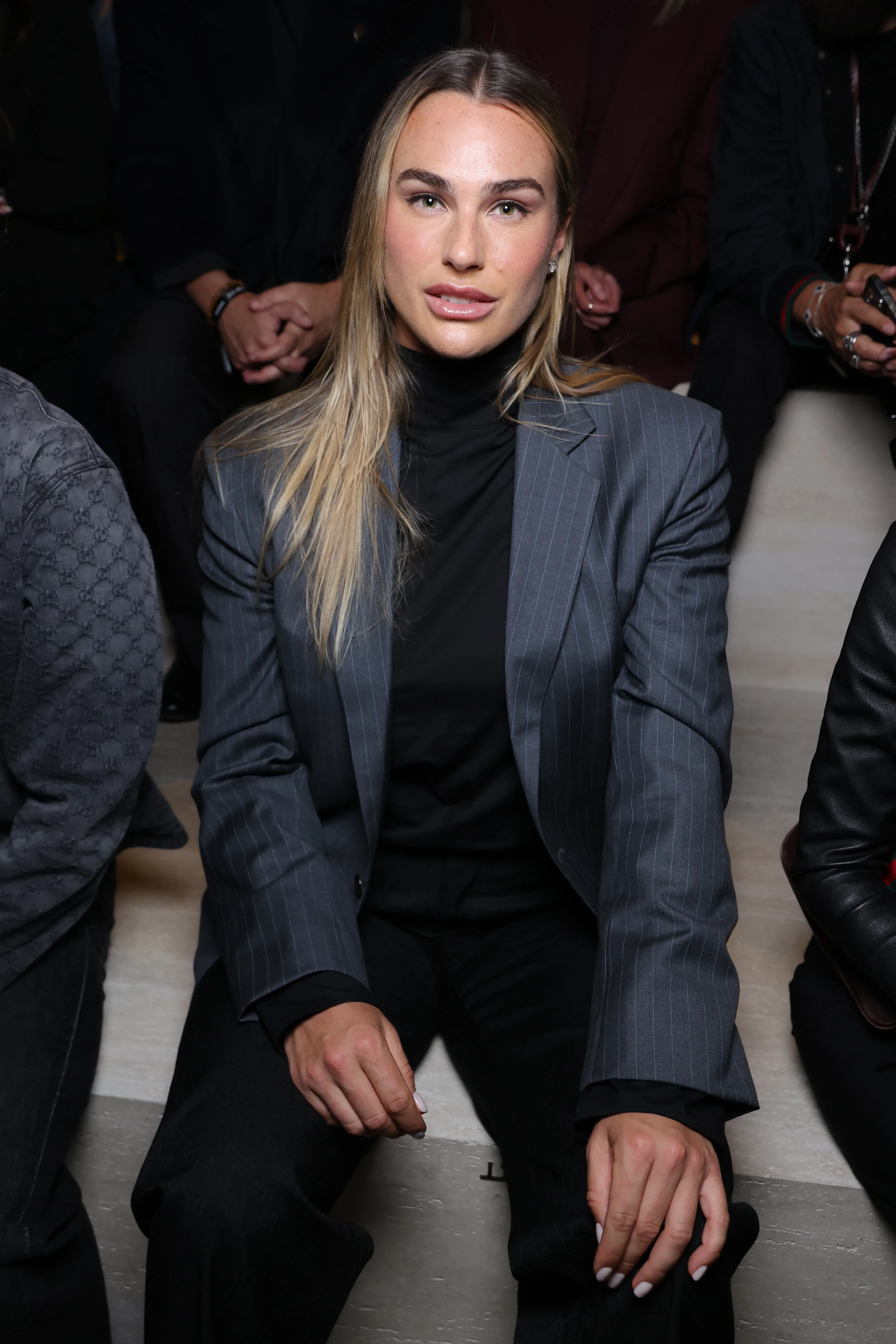 Деми Мурhttps://t.me/spletnik2006/49603Не смогла пропустить показ и давняя подруга Демны, 59-летняя Рената Литвинова. Актриса пришла в сером платье-накидке с отделкой из новой коллекции, а её 24-летняя дочь Ульяна Добровская выбрала красное платье-пальто (его же надела Донателла Версаче) и чёрную мини-юбку. 27-летняя первая ракетка мира Арина Соболенко, которая в начале года стала лицом Gucci, позировала фотографам в пиджаке в полоску, чёрной водолазке и классических брюках.