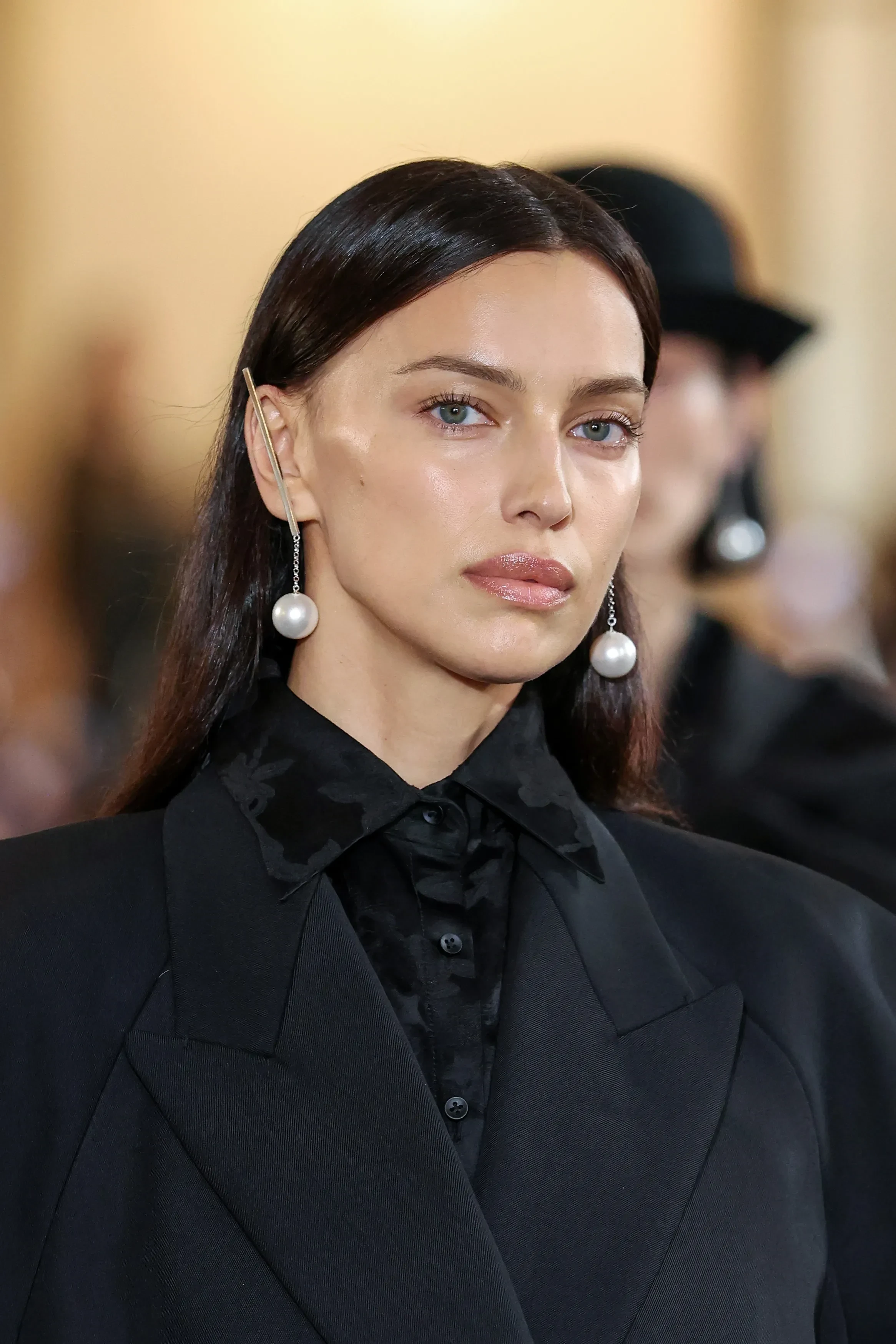 Ирина Шейк вышла на подиум на показе Uma Wang, который состоялся в рамках Недели моды в Париже. 40-летняя модель дефилировала в total black образе: на ней был жакет с объёмными рукавами, чёрная рубашка и макси-юбка. Завершали наряд балетки с бантами и фактурные серьги с белыми бусинами.