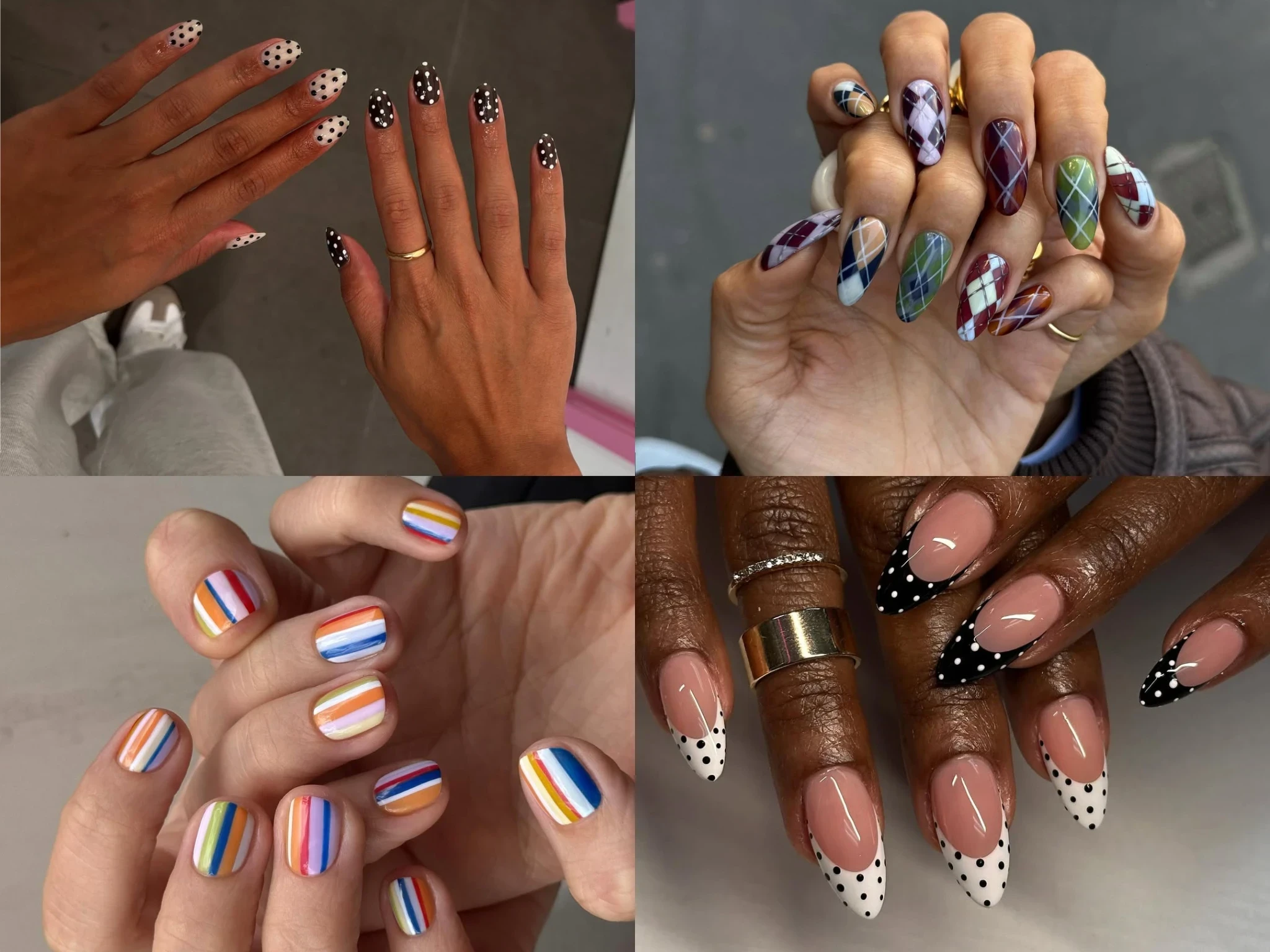 Френч с контрастными точками, разноцветные полосы, имитация текстильных узоров — чем точнее дизайн повторяет привычные нам принты одежды, тем актуальнее он выглядит. Главное правило — не бояться цвета и контрастов.