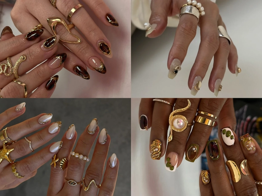 Золото, крупные камни, жемчуг, черепаховый узор, 3D-декор — чем богаче и заметнее, тем лучше. Такой маникюр идеально сочетается с массивными кольцами, перекликающимися с дизайном ногтей.