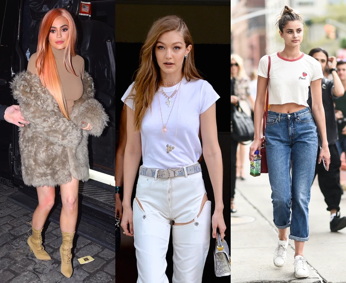 Скинни-джинсы, кожаные леггинсы или плотные узкие брюки носили с ботильонами или сапогами выше колена. Сверху надевали оверсайз-бомберы, косухи, пуховики, длинные пальто и растянутые кардиганы. Иногда их даже небрежно спускали с одного плеча — так часто появлялась на улицах Kendall Jenner.
