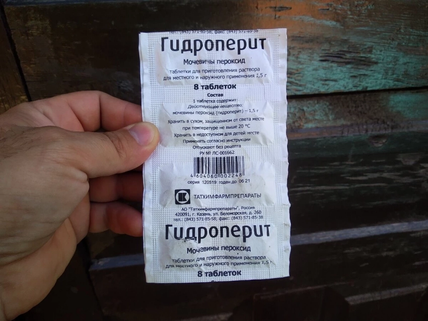 - 1 таблетку гидроперита растворите в 1 литре теплой воды.