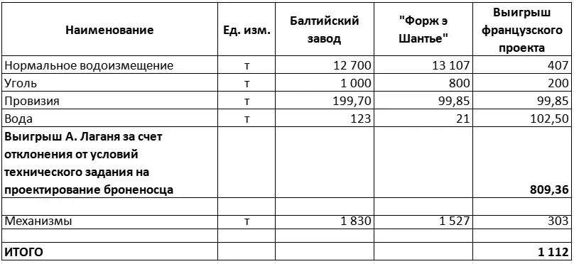 Но вернемся к проектам Балтийского завода и А. Лаганя. То, что французский броненосец оказался на 400 (если быть точным, то на 407) т тяжелее – это лишь половина дела. Потому что еще на 402,4 т французский кораблестроитель выиграл на экономии весов по разным статьям нагрузки, снизив таковые относительно проектного задания.